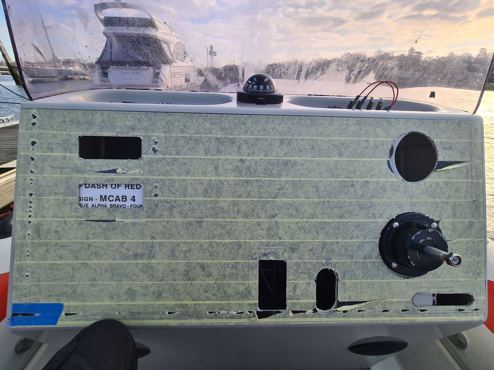 After cutting all the items out of the laminated engraving plastic, we used to create the panel, we took it back to the boat and marked all the holes on the dashboard and cut out anything new that required to be cutout of the original dashboard.